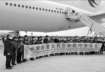 3月25日,中国第三批赴意大利抗疫医疗专家组乘坐的包机抵达意大利米兰马尔奔萨机场。中国第三批赴意大利抗疫医疗专家组一行14人25日抵达米兰马尔奔萨机场。专家组由国家卫生健康委员会组建,成员由福建省卫健委选派,并随所乘飞机携带了呼吸机、监护仪、口罩等中方捐助的医疗物资。 新华社发