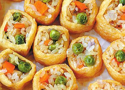 9.用勺子舀起一勺拌匀的糯米饭,塞入油豆腐中,尽量塞紧点。