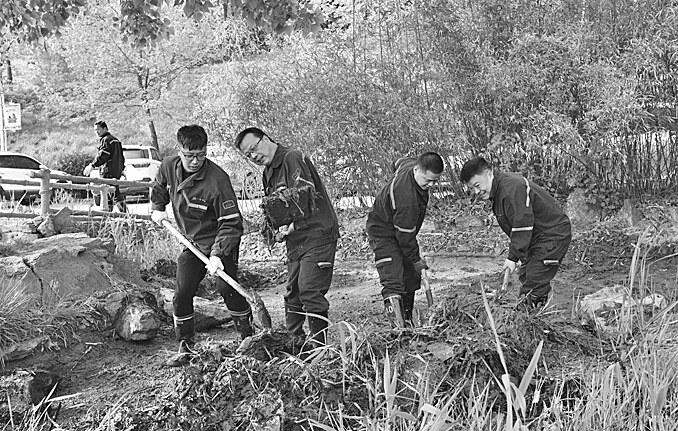 近日,义络煤业干部职工利用闲暇时间,全面整改矿区环境卫生。图为职工清理景观停车场池塘里的淤泥。石飞 摄