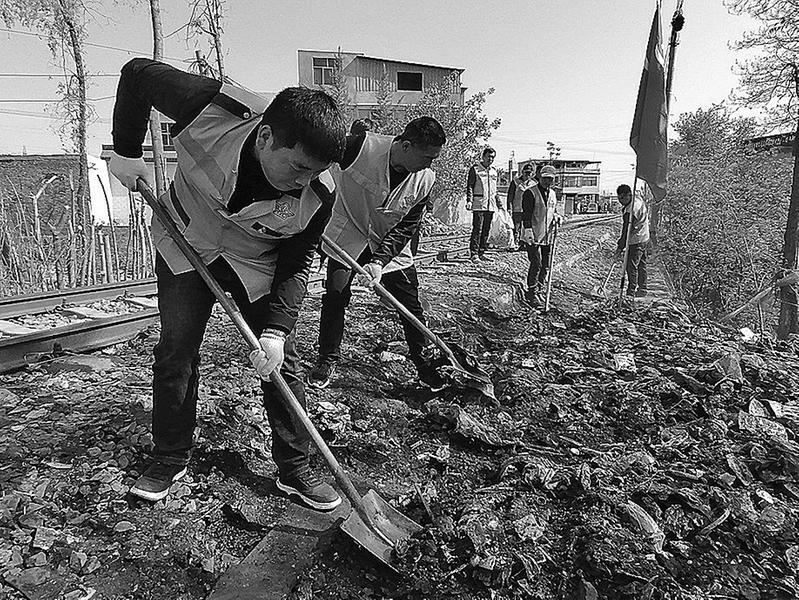 4月14日,铁运处组织开展环境清洁义务劳动,帮助周边群众改善生活环境。图为该处新安工电段党员帮助周边村庄清理生活垃圾。张方方 摄