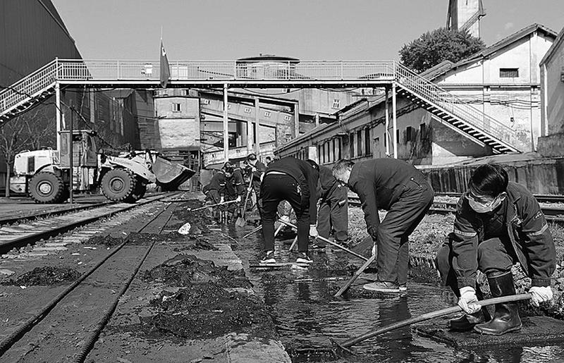 近日,千秋煤矿开展了“义务劳动作表率、党员奉献展风采”实践活动。图为该矿党员干部在铁道边清挖水沟。段小丽摄