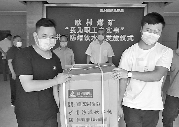 近日,耿村煤矿购买10台井下防爆饮水机,发放到基层单位职工手中,真正将职工身边事变成民生事、幸福事。