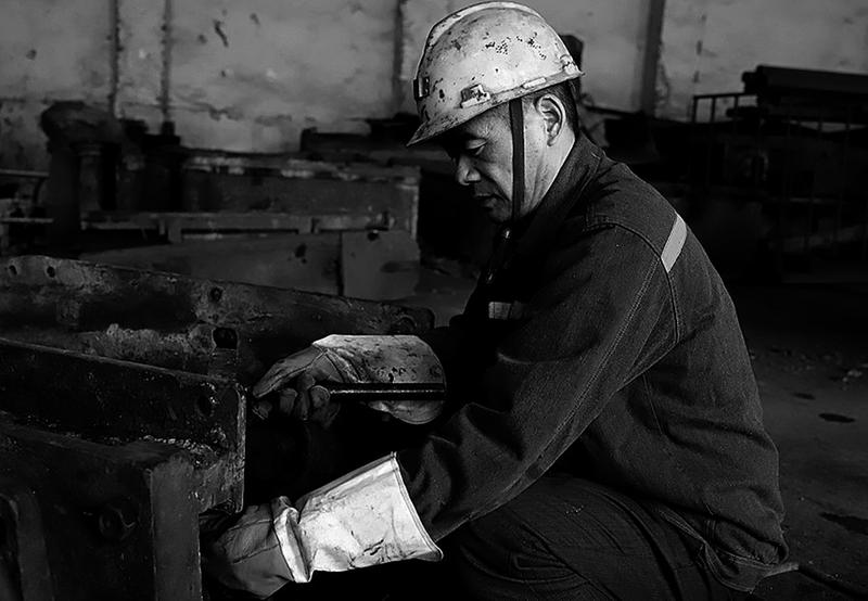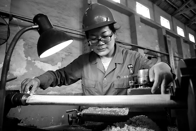图③职工在修理绞车滚筒保护罩。 段小丽 摄
