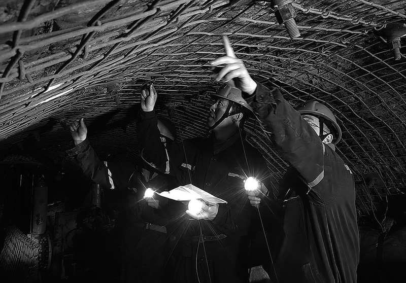①5月28日,管理人员在验收巷道锚网支护质量。