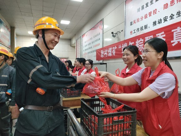 端午节到来之际,耿村煤矿在井口开展“端午粽飘香、真情嘱安全”协管活动。矿女工协管员们将粽子、牛奶、面包、鸭蛋等慰问品递到入井职工手中,并亲切叮嘱他们牢记安全,按章操作。图为活动现场。 任星辉 摄