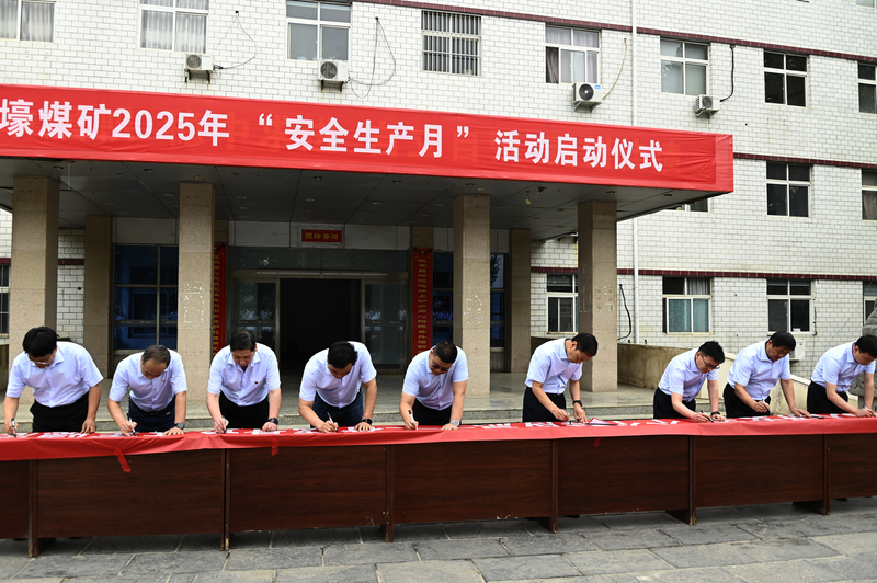 图③5月31日上午,石壕煤矿举行“安全生产月”活动启动仪式。活动中,全体人员进行了安全宣誓,在印有“人人讲安全、个个会应急——查找身边安全隐患”的横幅上郑重签字。图为启动仪式现场。 王萌 摄