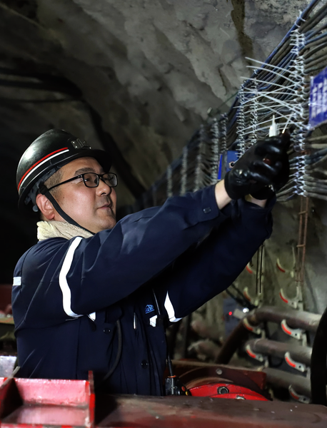 图③为通风队职工在检查气动风门连锁装置运行情况。