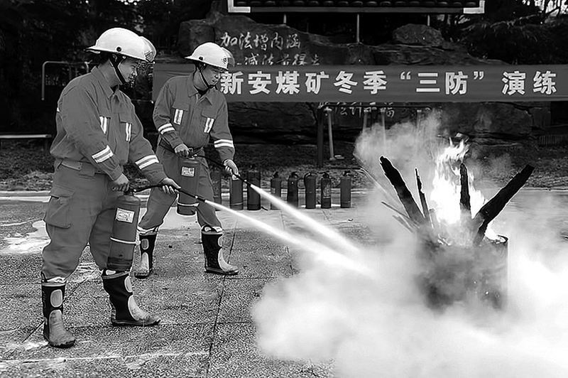 ◀新安煤矿加大冬季“三防”检查力度和频次,严格落实好冬季“三防”措施,为矿井安全生产保驾护航。图为消防特勤队员向职工演示灭火器使用方法。 侯丹 摄